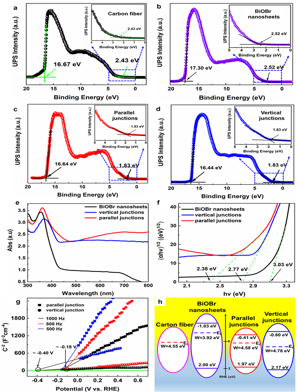 In view of this problem, Professor Liping Feng et al, from the Key Laboratory of Solidification, constructed a composite structure of ultra-thin two-dimensional BiOBr nanosheets and carbon fibers (CFs), and proposed a new idea to change the transmission path of photogenerated carriers and reduce the recombination of photogenerated carriers by changing the contact form between BiOBr nanosheets and CFs. In this scheme, by adjusting the preparation process of CVD, two-dimensional BiOBr nanosheets and CFs can present two completely different contact forms, namely, BiOBr nanosheets lying flat on CFs (BiOBr/C parallel junctions) or BiOBr nanosheets vertically inserted on CFs (BiOBr/C vertical junctions). The study shows that Schottky contact is formed between two-dimensional BiOBr nanosheets and CFs, and both parallel and vertical junctions have appropriate conduction band positions, which meets the thermodynamic requirements of photocatalytic decomposition of water for hydrogen production. Particularly, the parallel junctions have higher photocarrier yield and longer lifetime of electron-hole pair, and thus H2 production rate of the parallel junctions is up to 2850 μmol h-1g-1, which is 18 times that of the vertical junctions. Furthermore, the parallel junctions also show excellent characteristics of overall water splitting, and the H2 and O2 production rates are 240 μmol h-1g-1 and 110 μmol h-1g-1, respectively. In this work, the separation and transport characteristics of photogenerated carriers in two heterojunction systems are systematically analyzed. The whole process was demonstrated including photocarrier generated from two-dimensional BiOBr, separated and enriched to (001) crystal plane, and then transported to the active site of CFs by Schottky barrier. The influence mechanism of heterojunction morphology on carrier transport and catalytic performance is revealed, which provides a new solution to effectively reduce the recombination of photogenerated carriers in two-dimensional BiOBr.