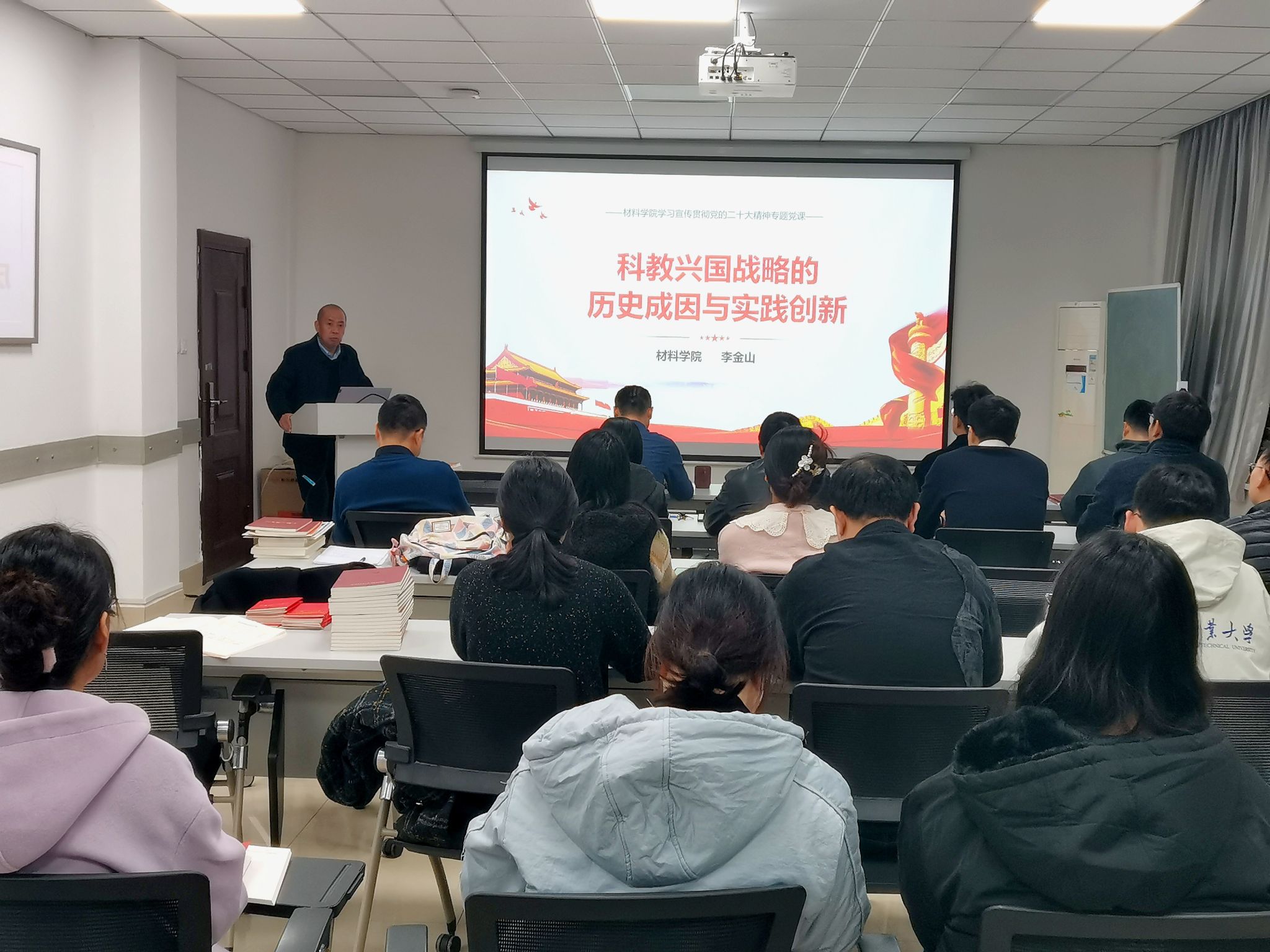 李金山以“科教兴国战略的历史成因与实践创新”为主题,围绕党的二十大精神,从科教兴国思想产生的历史背景出发,介绍了科教兴国理论的形成与发展,讲述了科教兴国理论的重要论述以及我国在科教兴国理论的指导下做出的实践创新,提出了西工大材料人科技报国的责任担当。李金山强调,要正确理解和认识教育、科技、人才是全面建设社会主义现代化国家的基础性、战略性支撑的重要地位,全面贯彻党的教育方针,落实立德树人根本任务,培养德智体美劳全面发展的社会主义建设者和接班人;要以国家战略需求为导向,集聚力量进行原创性引领性科技攻关,坚决打赢关键核心技术攻坚战;要坚持党管人才原则,加快建设世界人才中心和创新高地,要加强人才国际交流,用好用活各类人才。