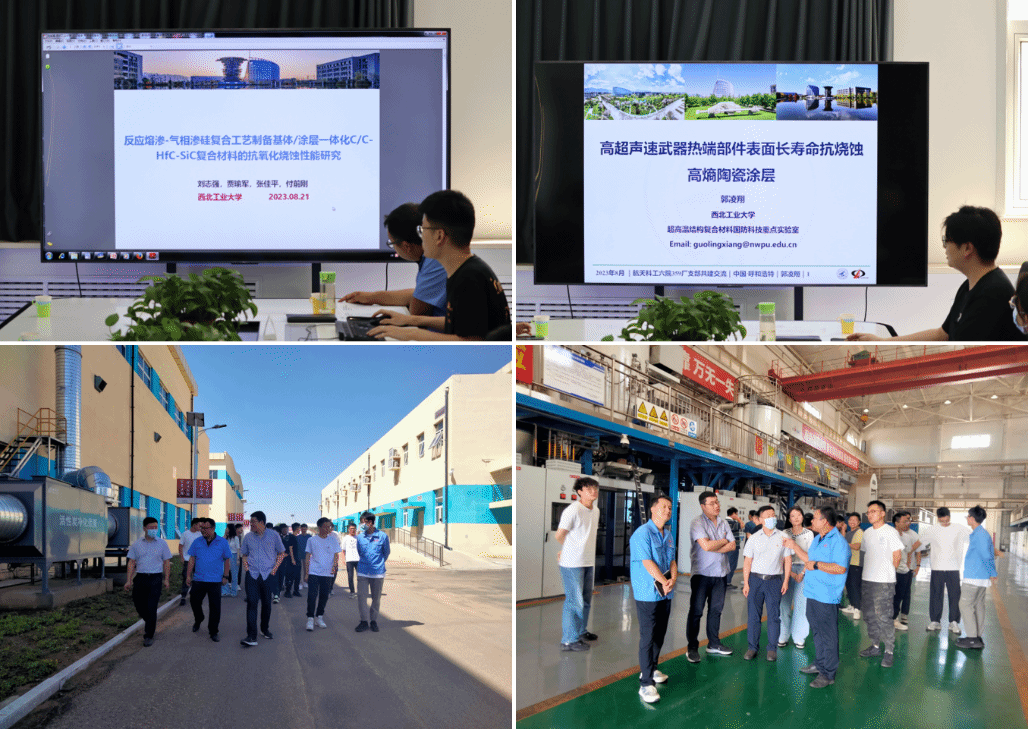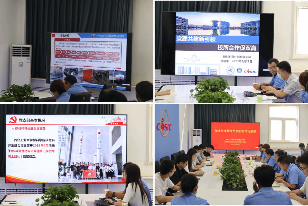 随后碳材料师生融合党支部书记贾瑜军和支部副书记赵元肖以及六院359厂新材党支部书记陈孝鹏分别就西工大碳/碳组科研团队及研究方向、碳材料师生融合党支部建设以及新材党支部建设方面进行了详细汇报。在严科飞主任带领下还参观了九分厂、碳碳研发部,实地体会国之重器关键部件的诞生历程,切实感受航天精神,厚植奉献国防意识。