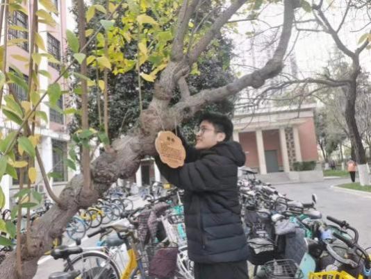 下午三点整,参与活动的老师和学生支部成员准时在公字楼门前集合,大家整装待发,跃跃欲试。本次活动主要分为两部分:在公字楼门前进行树木挂牌活动和在教学南路进行树木刷白活动。