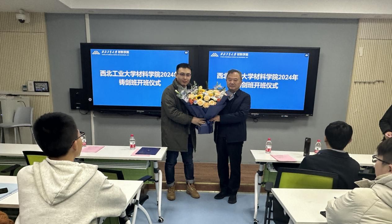 “铸剑班”是学院落实“总师型”人才培养要求的重要抓手。在党委学生工作部的指导下,由学院党委组建实施。学院按照总师型人才培养理念和内涵要求,以“四翼赋能”为手段,充分发挥第二课堂作用,以期全面提升学生综合能力。学院邀请李贺军院士担任荣誉班主任,冯婷婷、张玉台老师担任班级教导员。开班仪式上,付前刚为李贺军院士颁发聘书,张玉台为李贺军院士献花。