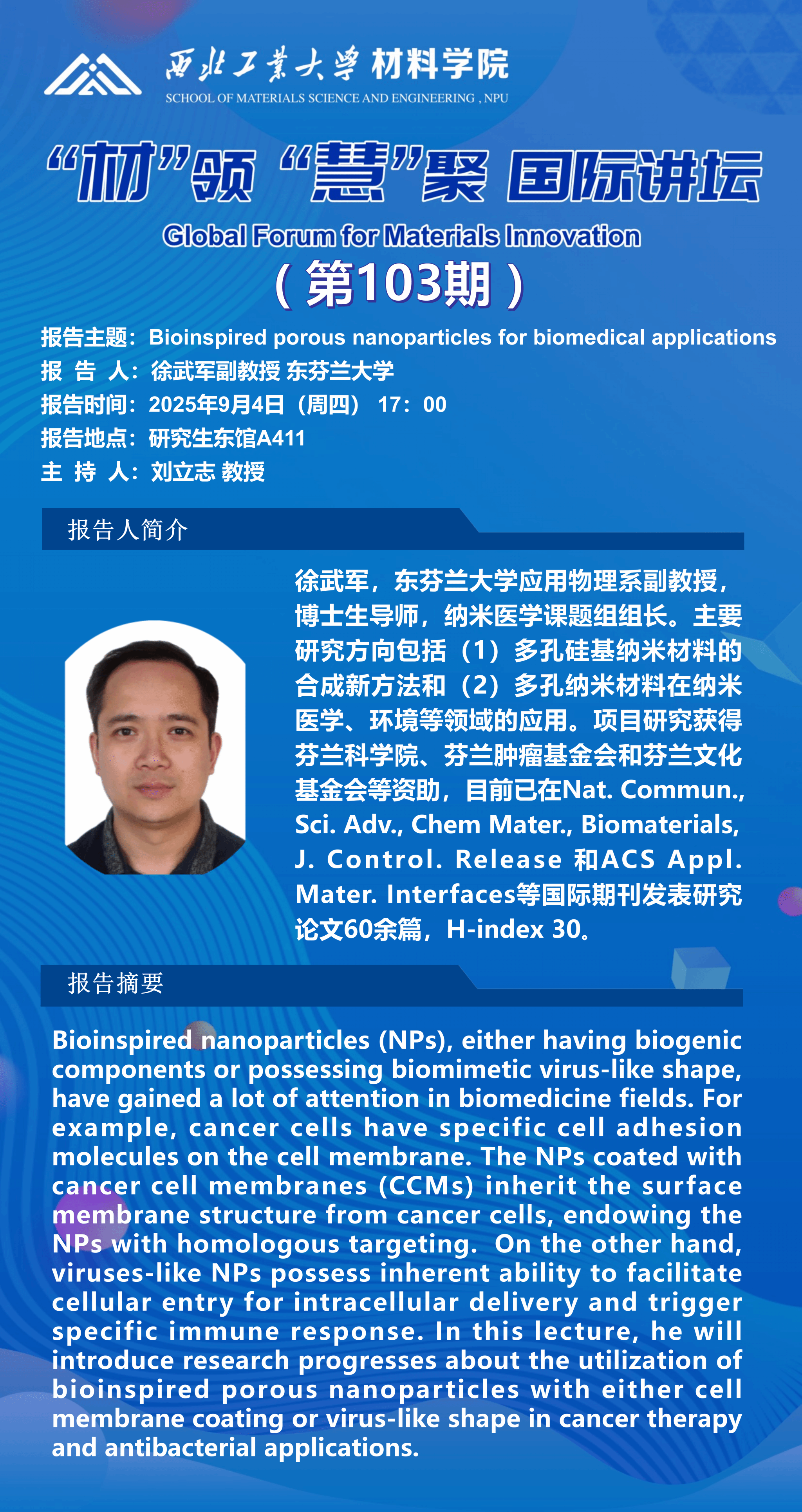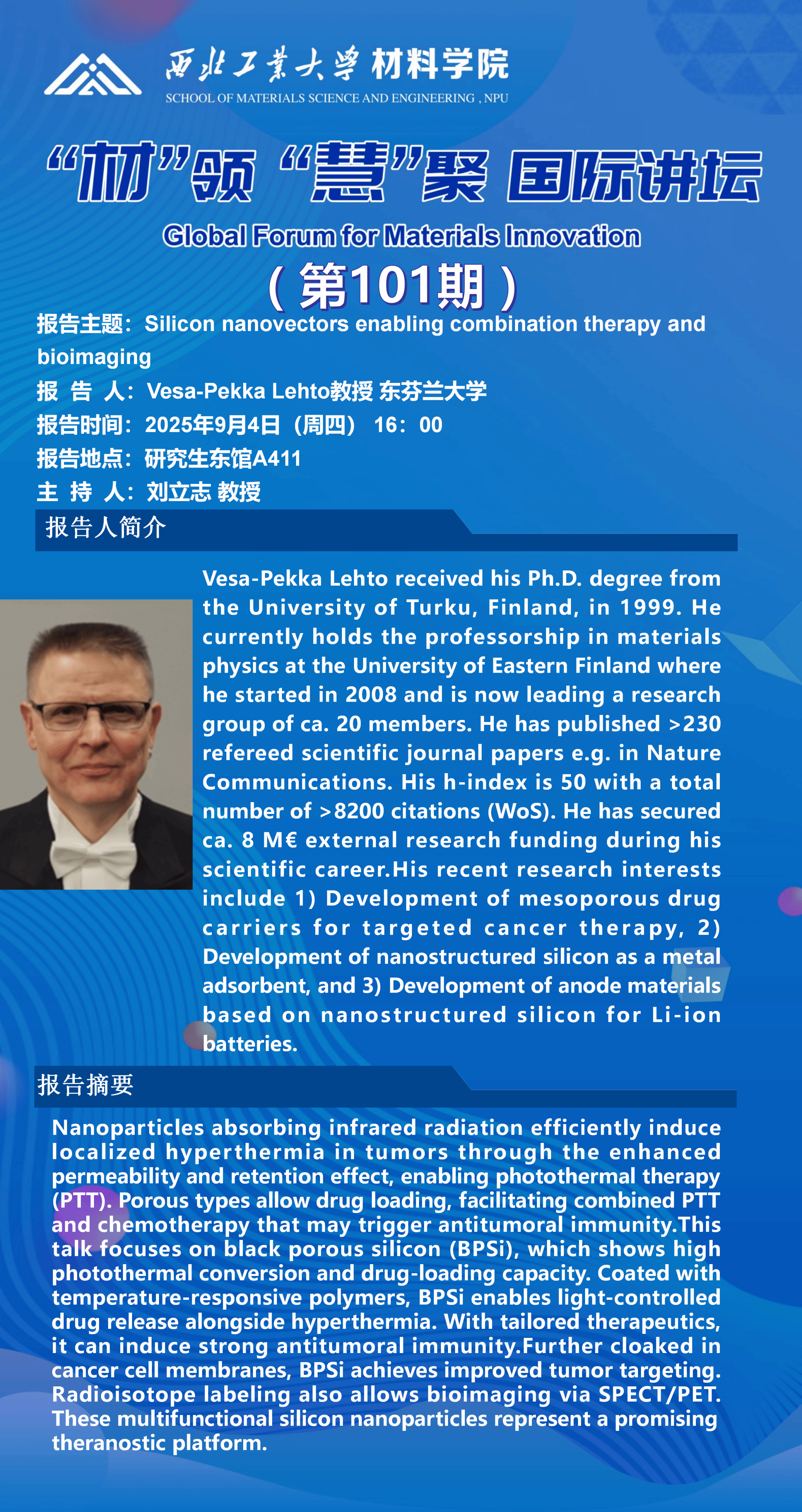国际讲坛:Silicon nanovectors enabling combination therapy and bioimaging;Causes and consequences of NRF2 dysregulation in cancer;Bioinspired porous nanoparticles for biomedical applications