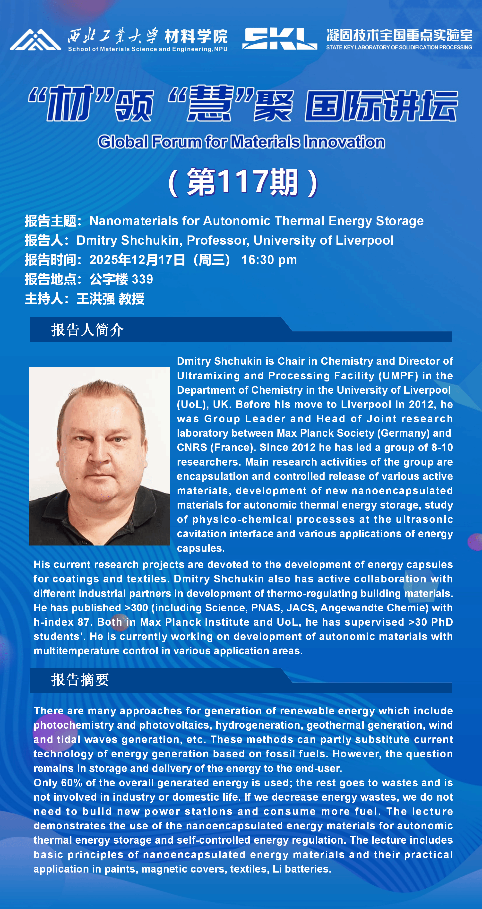 报告人:Dmitry Shchukin, Professor, University of Liverpool