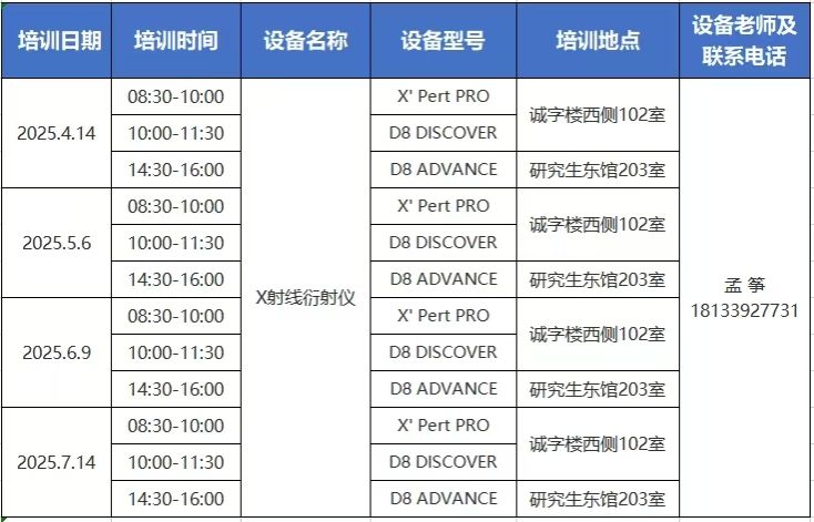 科教实践与材料分析创新中心(以下简称“中心”)拟每月定期开展X射线衍射仪设备操作培训与X射线衍射实验室安全培训,完成实验室安全培训的学生方可预约X射线衍射实验,通过设备操作考核且能熟练操作设备的学生可获得“7×24h”折扣机时操作资质。培训面向校内免费开放报名,欢迎有相关测试需求的学生报名参加。具体报名要求和注意事项如下: