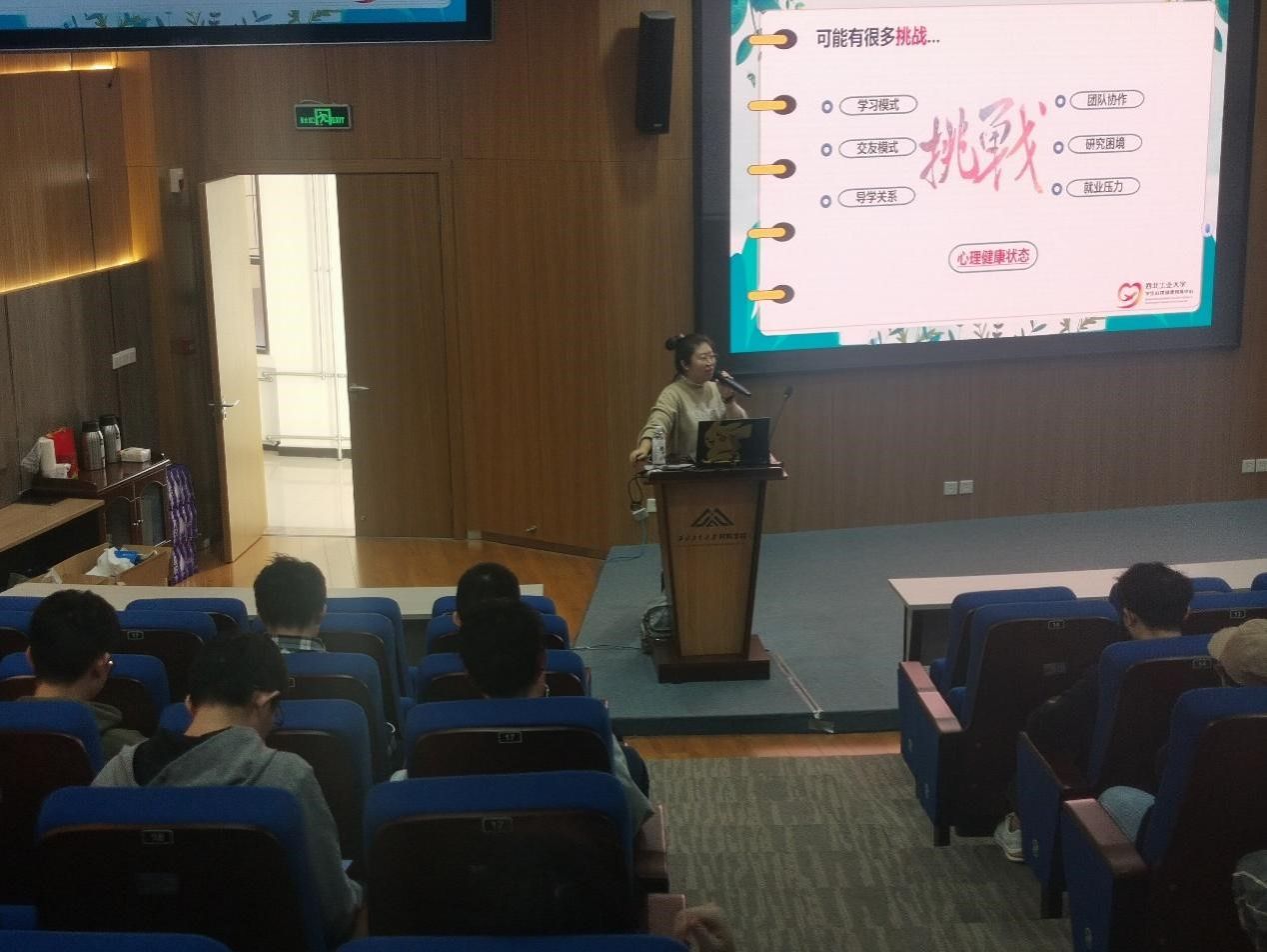 培训由西北工业大学心理健康教育中心的唐婧老师主持。唐老师从情绪低落与抑郁的差异切入话题,并带领大家探讨了在面临研究生生活时,如何调整自身心理状态,以一种积极健康的精神去面对上述挑战。同时针对入学后进行的心理测试结果,逐项为大家解释分析,让大家进一步客观科学地认识了自身的心理状态。并结合案例分析,为大家讲解了心理健康素质与心理健康水平的差异,让同学们进一步了解认识了心理健康在工作生活中的引导性与重要性。最后,就心理健康认识与同学们展开交流互动,引导同学们敞开心扉,直面自身心理状态,勇于分享自身心理困惑,并积极寻求专业帮助。