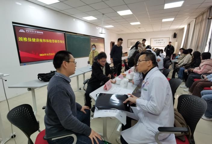 11月21日,材料学院与校医院联合举办颈椎健康讲座暨2024年教职工体检报告答疑咨询会。校医院院长助理田博、体检中心主任陈金华、中医理疗科康复治疗师王国强等9名医护人员及学院40余名师生参加。活动由学院分工会主席张勇主持,院长助理孙磊参加会议。