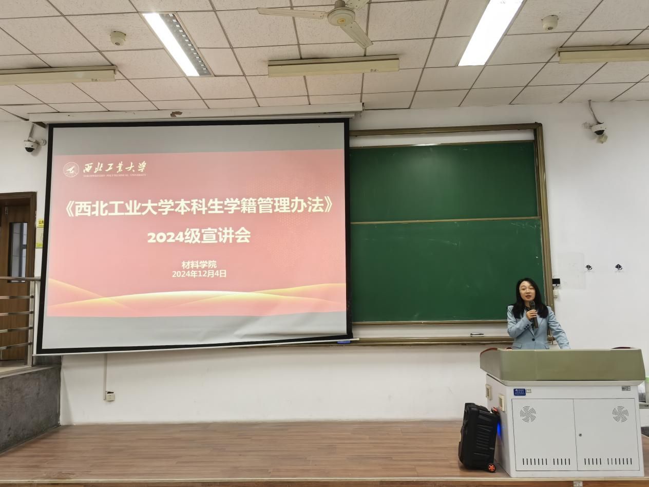 为进一步推动“总师育人文化”走深走实,加强教学管理和教风学风建设,12月4日,材料学院在长安校区组织召开《西北工业大学本科生学籍管理办法》宣讲会,材料学院副院长罗皎、2024级辅导员张玉台和2024级全体本科生参加。会议由张玉台主持。