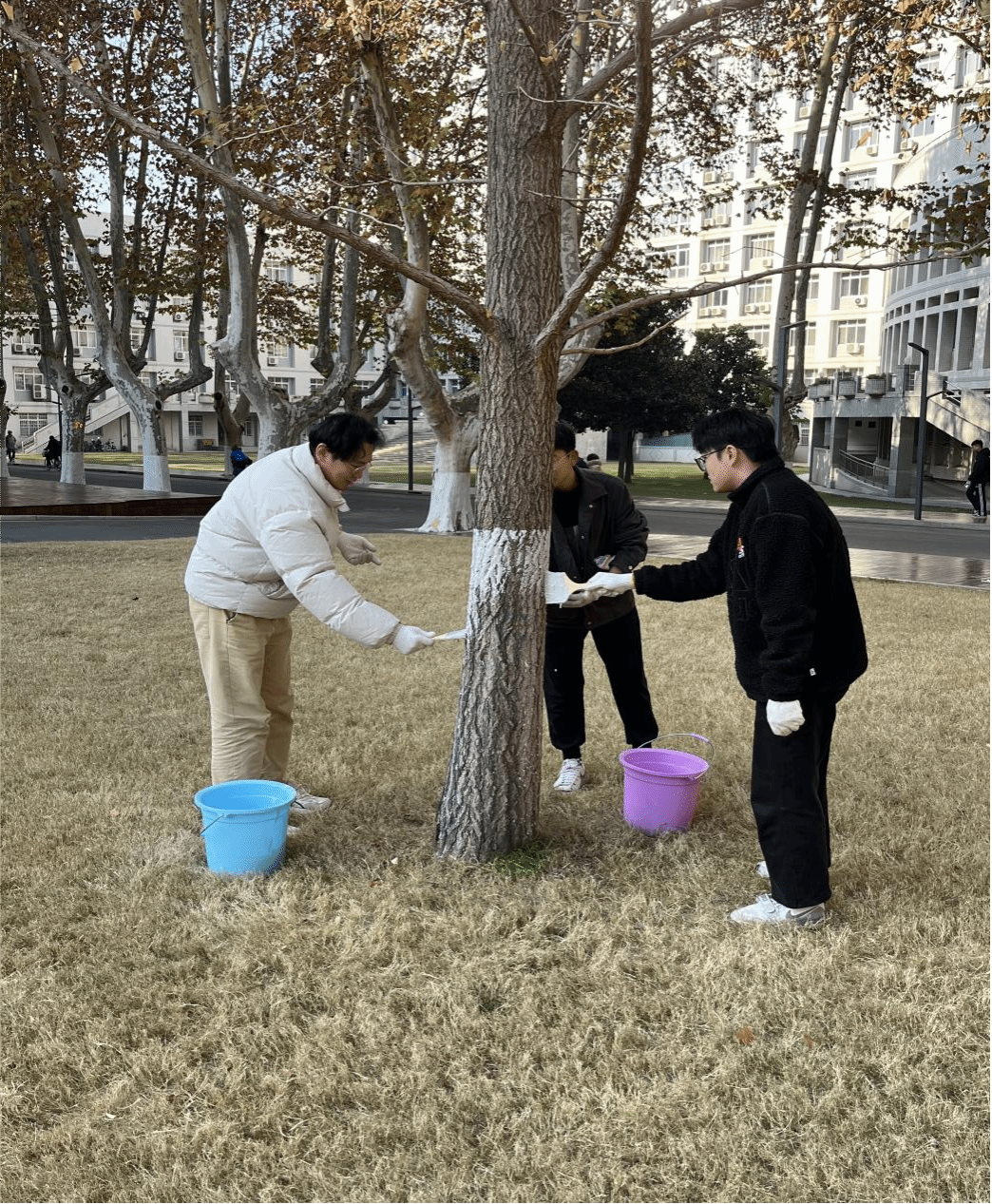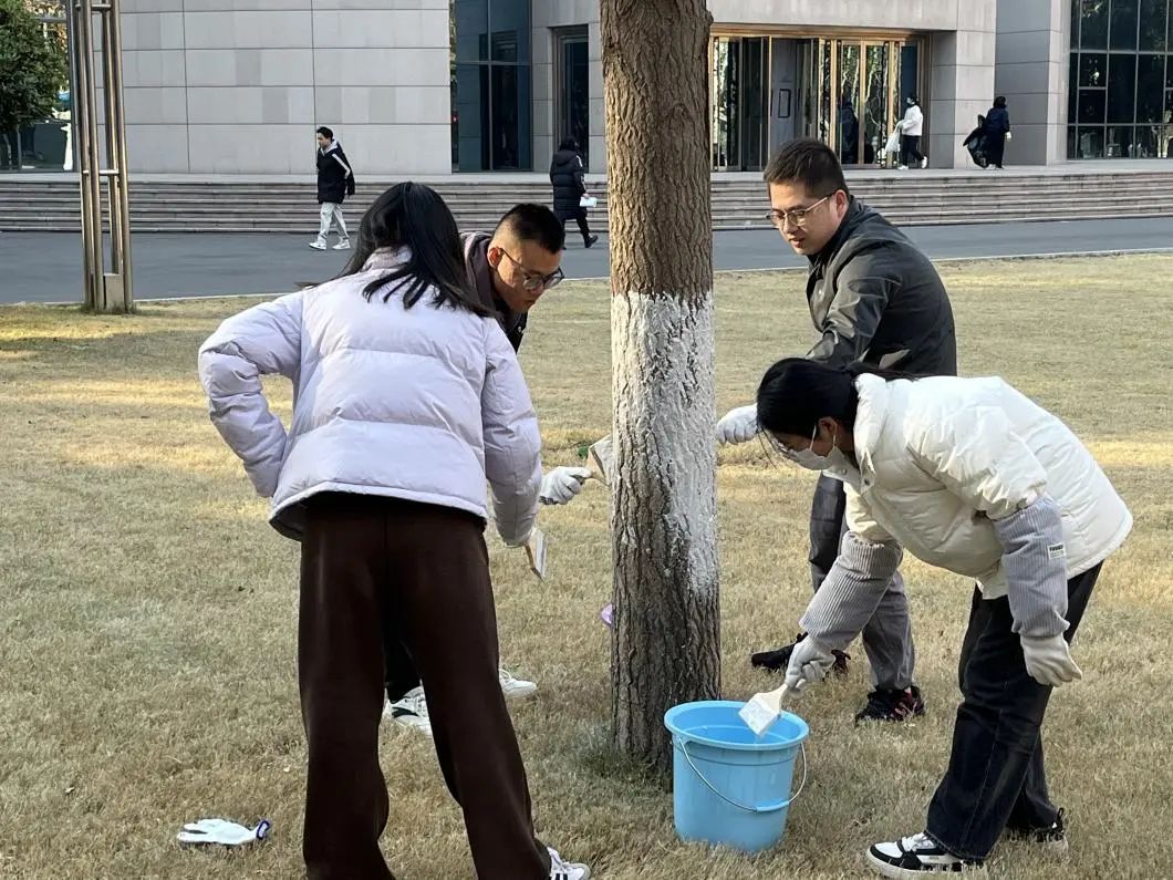 后勤集团工程服务中心贾师傅详细介绍了树木刷白的相关知识和注意事项,指导支部师生对新图书馆前的树木进行刷白。