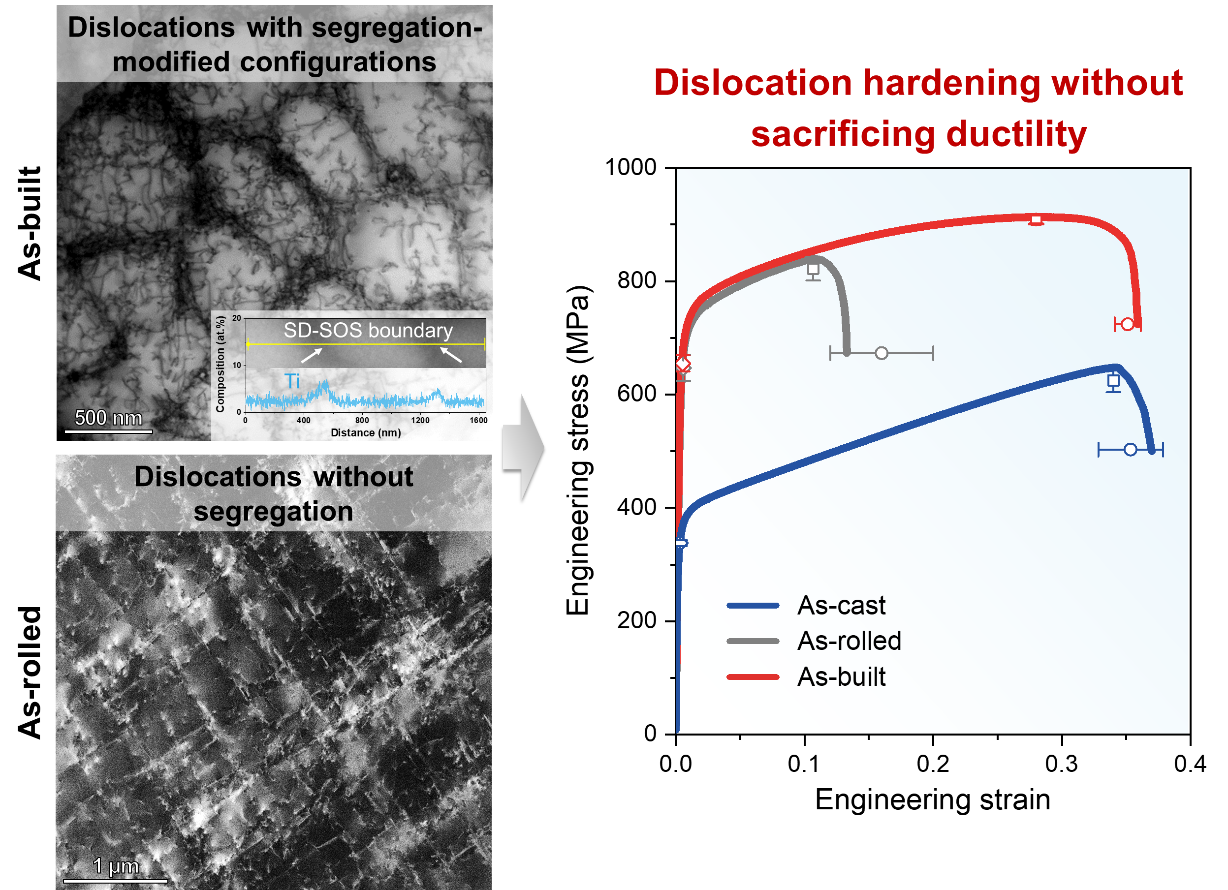 位错是晶体塑性的本源,然而经典位错强化理论认为材料的初始高密度位错虽能有效提升合金强度但必然严重损害塑性。日前,西北工业大学材料学院王锦程、林鑫教授团队通过增材制造极端非平衡凝固和复杂热循环调控中熵合金初始位错组态,实现了高密度位错显著提升合金强度而不损害塑性,打破了位错强化必然牺牲塑性的传统教科书认知。