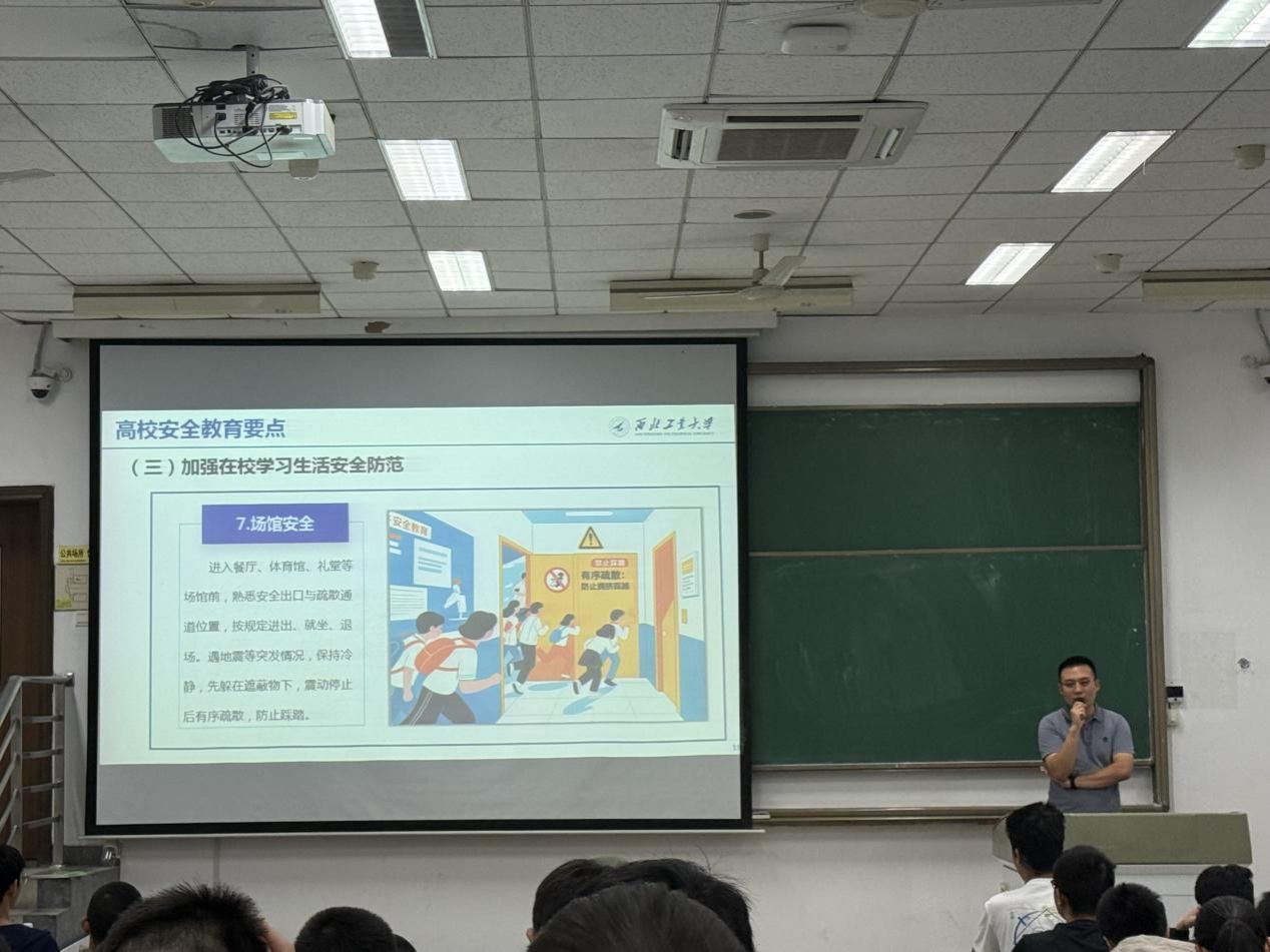 张玉台围绕“全方位筑牢安全防线”主题,结合校园真实案例,从校内宿舍用电安全、实验室操作规范,到校外出行防护、网络诈骗防范,再到心理情绪调节、日常体育锻炼等方面,进行了细致讲解,引导新生牢固树立“安全第一”意识。