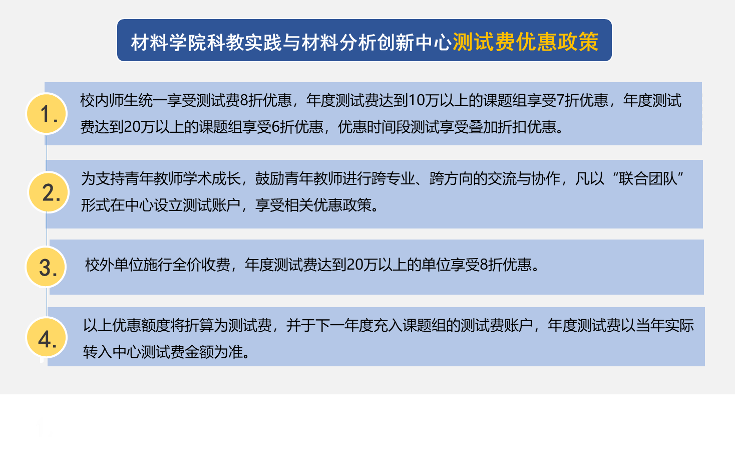 为进一步支撑“总师型”人才培养,大力推进“1→0”工程科学问题研究,奋力提升科学研究水平和社会服务能力,助力学校“127”发展目标和“天下工大、世界三航”远景目标实现,材料学院科教实践与材料分析创新中心(陕西省材料分析研究中心)2024年度继续实施测试费优惠政策。自2019年至今,中心已连续六年实施测试费优惠政策,累计发放奖励金额1325.88万元。