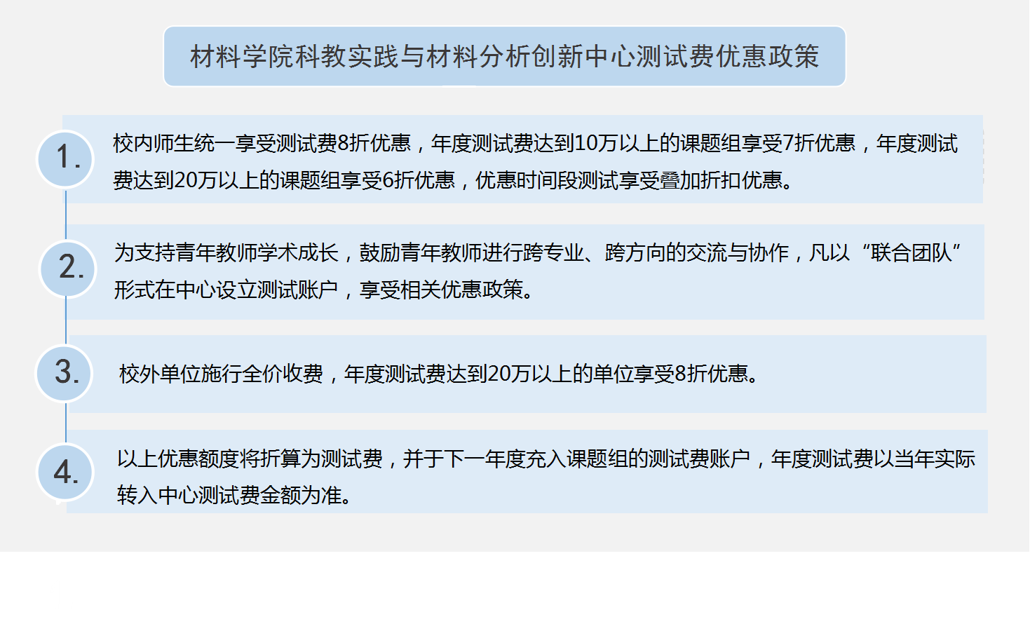 为鼓励校内外师生广泛使用中心设备,利用分析测试技术进行基础性、前沿性和创新性研究,支撑教学科研成果产出,助力学校人才培养,2019年起材料学院科教实践与材料分析创新中心(陕西省材料分析研究中心)制定并实施测试费优惠政策。经2021年度核算,共有119个课题组享受测试费优惠奖励,总发放奖励金额198.6万元。其中10个课题组享受六折优惠,最高奖励金额28.6万元;10个课题组享受七折优惠,最高奖励金额4.8万元。